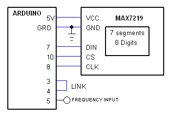 C code is for setting timer2 and timer0 to generate 1 second time base divided from the 16MHz crystal, timer1 is the counter. The 7 segment display MAX7219 is driven by software SPI, bit banging the 16 bits command to the display driver. The Arduino uno can count up to 6 MHz so digit 8 is not used. Leading zeros are blanked.