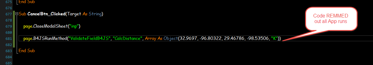 'Page.B4JSRunMethod("B4JSCalculateDistance", "CalcDistance", Array As Object(32.9697, -96.80322, 29.46786, -98.53506, "K"))