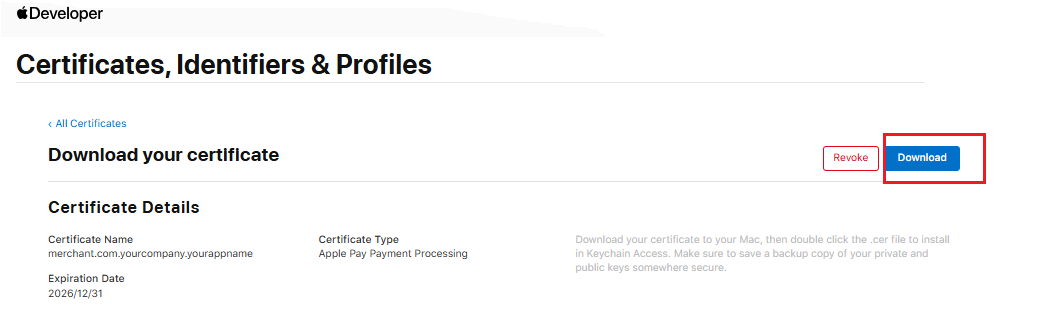- Download the Apple Pay Payment Processing Certificate and put it in your project keys folder, and put the private key and signing request certificate in somewhere secure.