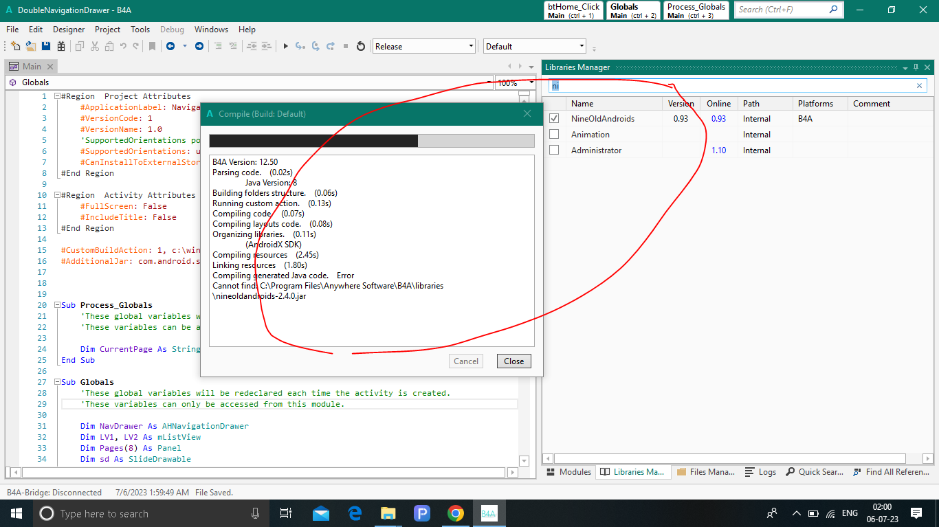 I am trying to run AHNavigation Drawer example code from below link but it is shows an error message as "Cannot find: C:\Program Files\Anywhere Software\B4A\libraries\nineoldandroids-2.4.0.jar".Please chceck below screenshot and advise how to resolve this issues