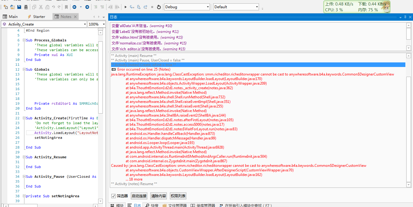 activity.loadLayout("LayoutNotes") 'the layout where I added a SMMrichEditor view in the designer. The error occurred at this line