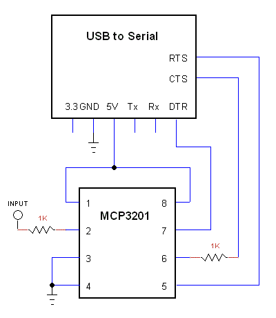 Measuring analogue signal on PC without the need to program a microcontroller. The MCP3201 is a 12 bit ADC, the USB to Serial module drives the ADC by bit banging the Hardware Controls (Flow Controls).