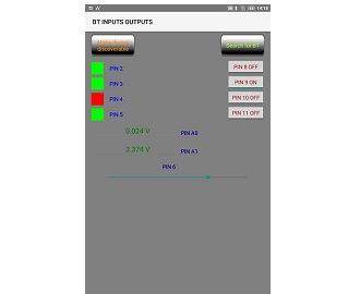 B4A app to control inputs and outputs of Arduino connected to Bluetooth module HC-05. Arduino sends 9 bytes, first byte=129 to mark the start and then 8 bytes 7 bits each of data. B4A sends 2 bytes. Update is every second.