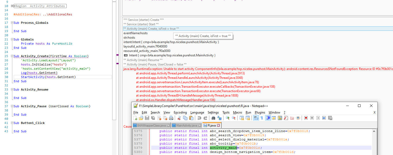 java.lang.RuntimeException: Unable to start activity ComponentInfo{b4a.example/top.nicelee.purehost.MainActivity}: android.content.res.Resources$NotFoundException: Resource ID #0x7f0b001c