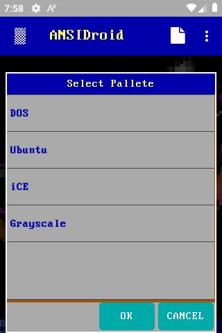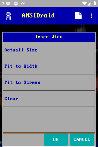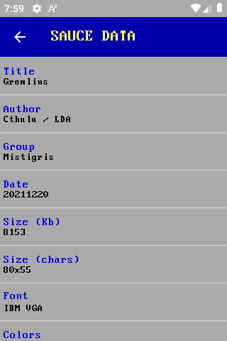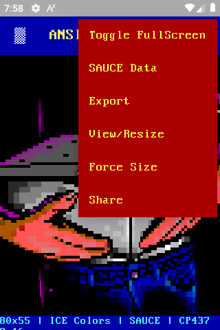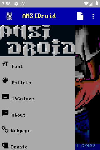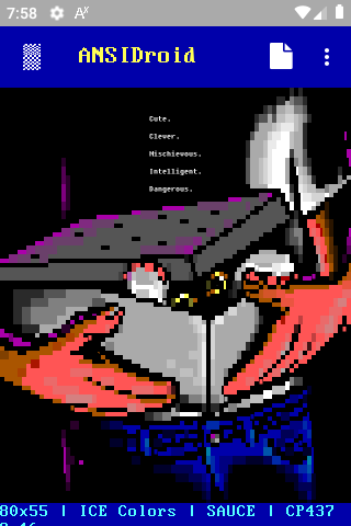 Another "weird" app of mine, to render and display ANSI art in Android smartphones. You can download any .ANS, .DIZ, .NFO, even .TXT file and render it on the fly on your phone. It supports SAUCE data , various palletes for matching colors and many, many, many bitmap fonts to achieve 100% accurate font display, as many TTF fonts don't include all CP437 chars. You can also add your own bitmap fonts. After the ANSI file is rendered to an image, you can share it or just save it and use it ex. as a wallpaper