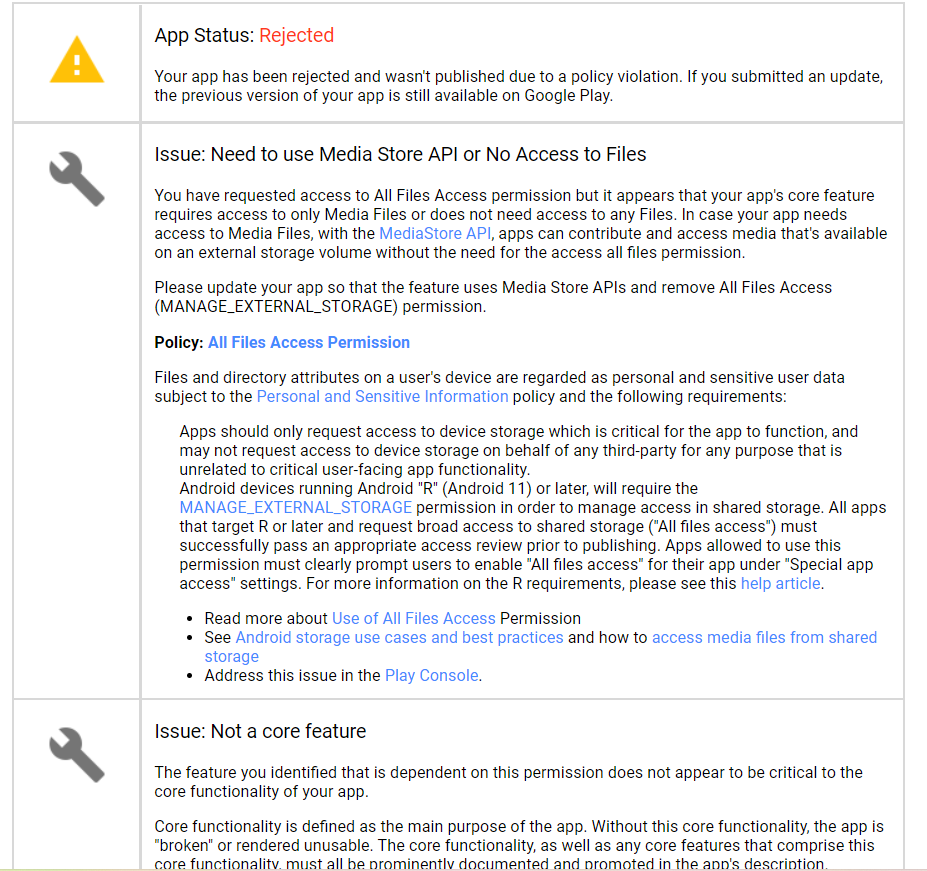 Everything works fine but one of these apps was rejected by the Play Store because according to them access to the memory was not necessary and they recommend using the Media Store API.