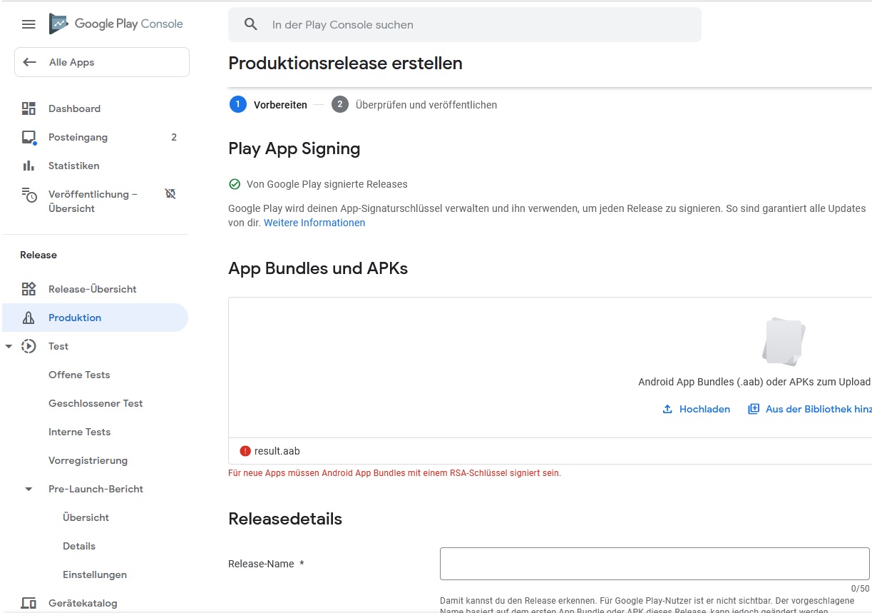 Jetzt wollte ich diese auf Googel-Store hochladen.