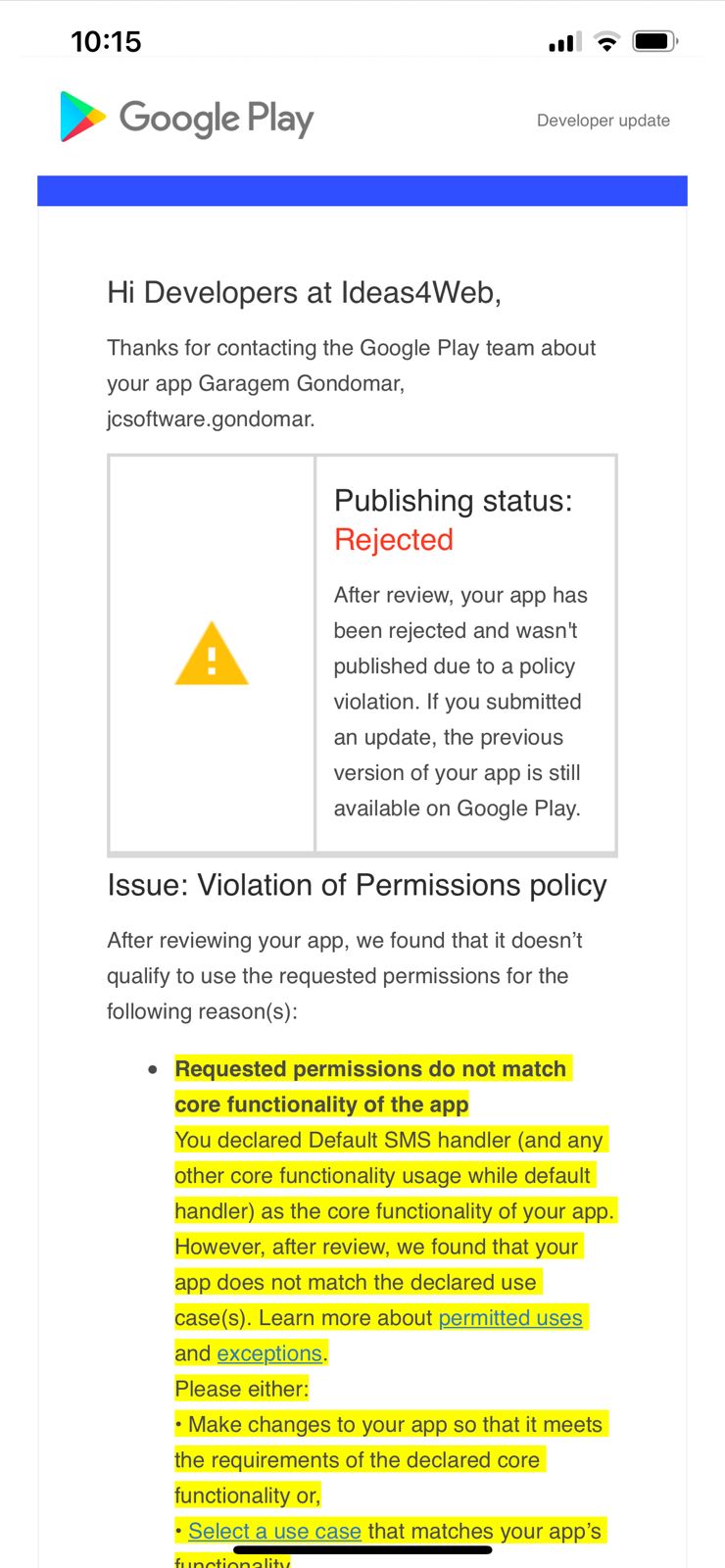 Google has changed their policy regarding the following permissions: READ_SMS, SEND_SMS, WRITE_SMS, RECEIVE_SMS READ_CALL_LOG, WRITE_CALL_LOG, PROCESS_OUTGOING_CALLS Only the default phone or messaging apps can use these permissions...