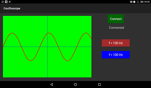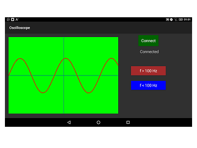 Low frequency oscilloscope for Android using Arduino Uno or Nano, frequencies up to 5KHz. The software for Android is in B4A. The Arduino connected to Android device via USB OTG cable. The sampling is done by the Arduino ADC in a speed of about 20K sampling per sec. The Arduino software is mostly in C code in aim to get wider bandwidth and use the analog comperator. The Arduino takes 62 samples of input to create one screen. For lower frequency a delay of 1mS for each sample gives slower sweep.