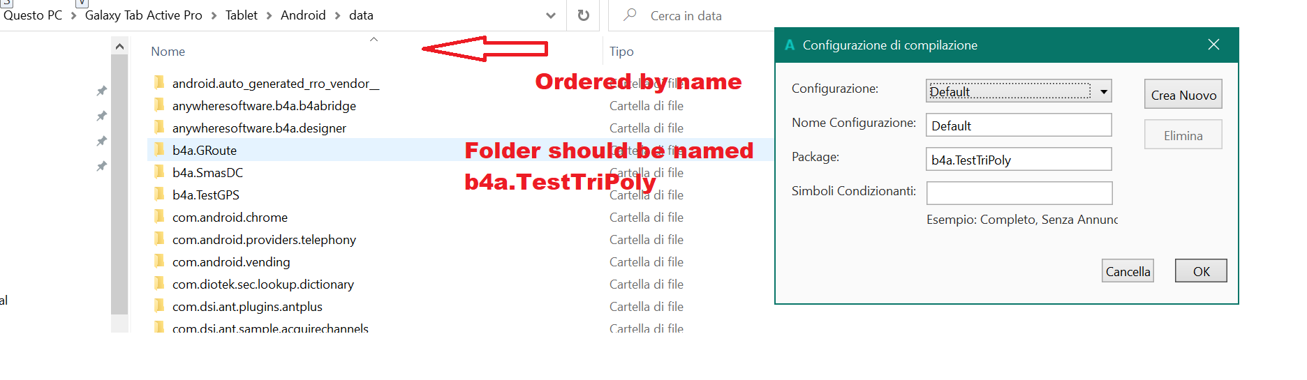 to day I had another surprise: till now, when I did an App and run it on a Tablet, I always found inside Android/Data a Directory with the name of tha App. To day I need to do a test, reading a file and I was looking for such a directory (which, btw, is the fastest way to write files that the App must read). Normally I put files there by a cable connection. To day, after preparing the Test App, i went to Android/Data in the tablet and I don't find any subdirectory with the name of the new App. Of course I gave the name to the package.. I connected and disconnected the cable.. Changed the App name ...I develop Apps on B4A since 2011 not since yesterday .. so the only explanation may be that I am "gone" (the first of course) ... or the geniuses that develop Android had a new idea to help us to save time with useful tricks ... I even have shame to post such a problem .. Forgive me in advance ...