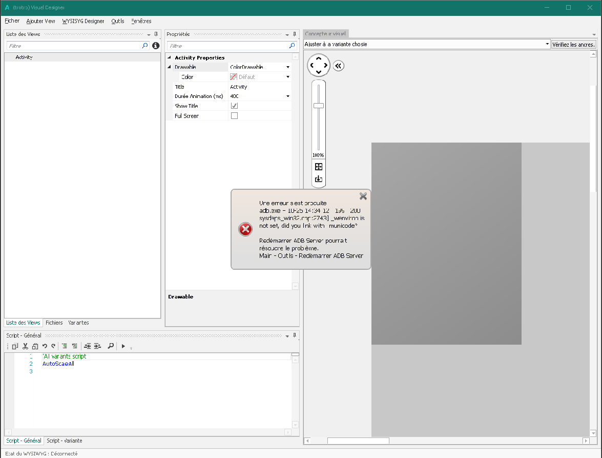 'adb.exe F 10-25 ....... 199 200 sysdeps_win32CPP: 2743] _wenviron is not set, did you link with-municode?' redémarrer ADB pourrait resoudre le problème