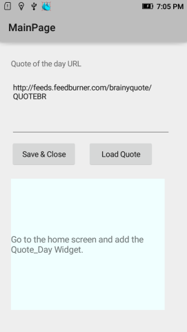In widget touch the 'play' button and it will load quote from the url and display. There are 4 quotes and widget displays them one after another.