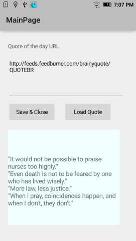 In main screen you enter the url (taken one from original sample of Erel). Check it with 'Load Quote' button. 'Save & Close' the app.