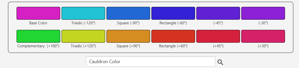 In sync with changes to the Cauldron color, the Variants panel shows key color companions at various angles around the color circle. These tend to go well together in a palette.