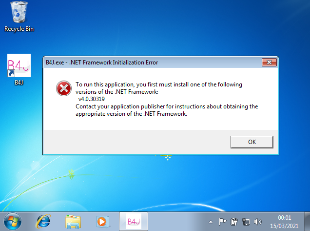 After installing B4J Version 8.90 on a new installation of Windows 7 32 bit, B4J did not open and a message appeared saying that it needs Dot Net Framework version 4.0.30319