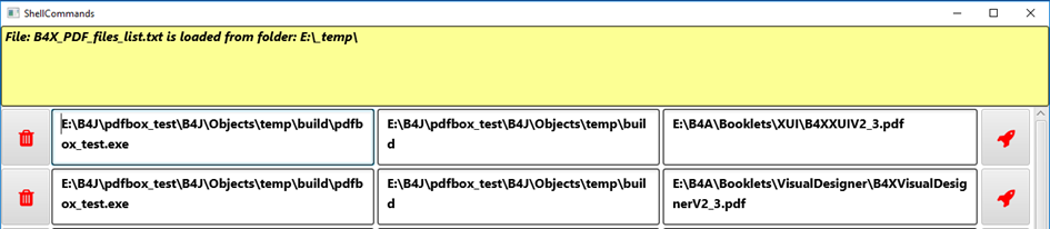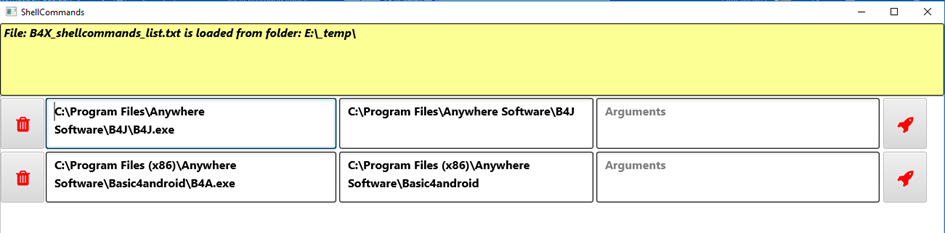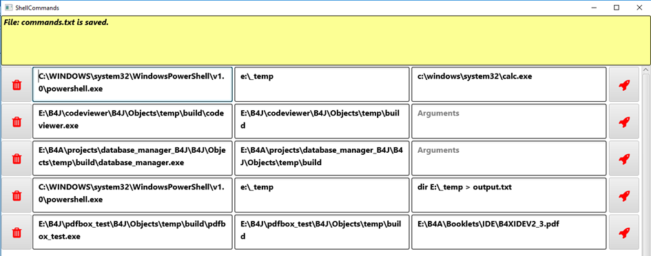 Each line consists of an Executable entry, a Working directory entry and an Arguments entry.