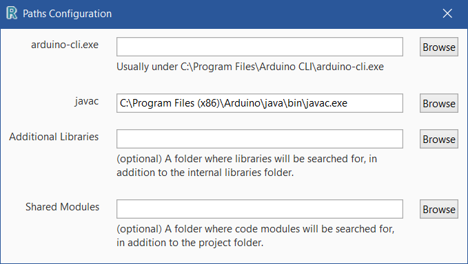 - B4R - Tools - Configure Paths: configure the path to arduino-cli.exe and javac. Java 8+ is supported.