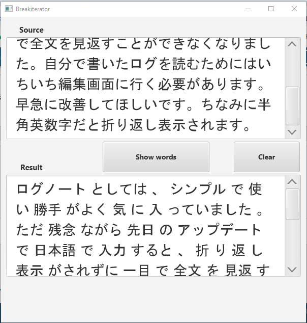 BBLabel1.Text = "ログノートとしては、シンプルで使い勝手がよく気に入っていました。ただ残念ながら先日のアップデートで日本語で入力すると、折り返し表示がされずに一目で全文を見返すことができなくなりました。自分で書いたログを読むためにはいちいち編集画面に行く必要があります。早急に改善してほしいです。ちなみに半角英数字だと折り返し表示されます。"