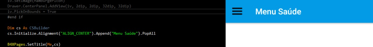 hello everyone !! i am trying to align title bar text to center horizontally , but dont works ... :c code : B4X: Dim cs As CSBuilder cs.Initialize.Alignment("ALIGN_CENTER").Append("Menu Saúde").PopAll B4XPages.SetTitle(Me,cs)