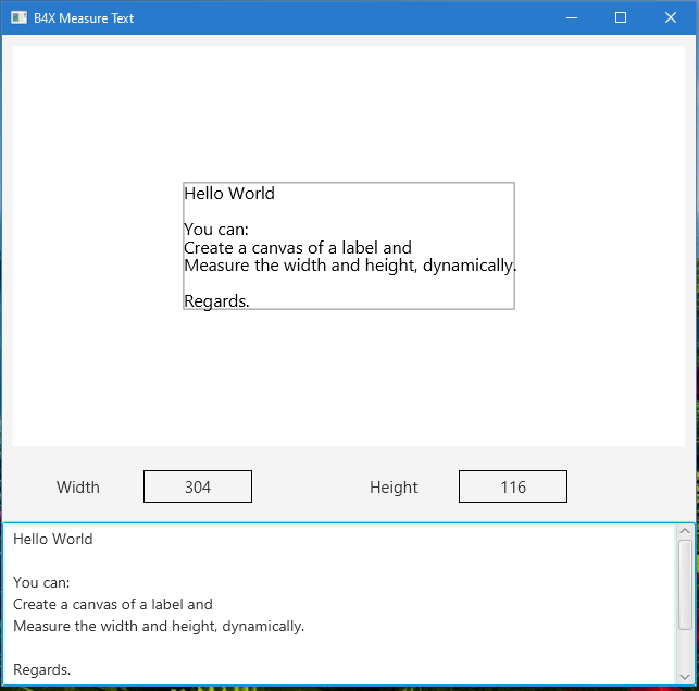 Hi Erel, The title says the wish. Currently, there are three different routines in the class with different results. Example: MeasureTextHeight("Mg") and MeasureTextHeight("M") give different results in B4A because the real height is different, but give the same result in B4J. I have not checked...