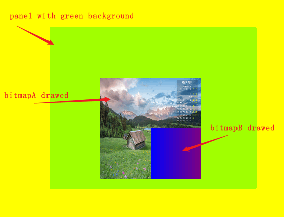 In an exercise, I first drew bitmapA loaded from the asset folder and then drew bitmapB created by BitmapCreator.drawFillGradient. Both images have targeted the same rectangle.