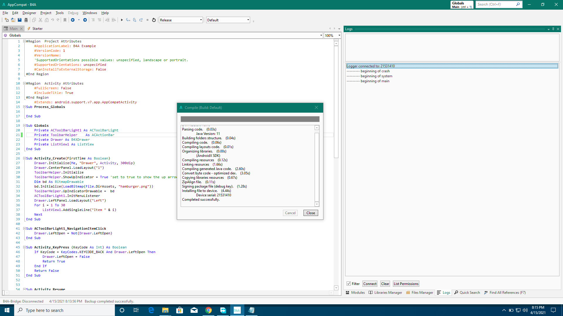 I am trying to run the B4XDrawer made by Erel, and I am having trouble. The example project build successfully but it crashes after installing saying