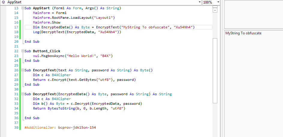 Dim encryptedData() As Byte = EncryptText("MyString To obfuscate", "Xu54Nh4")