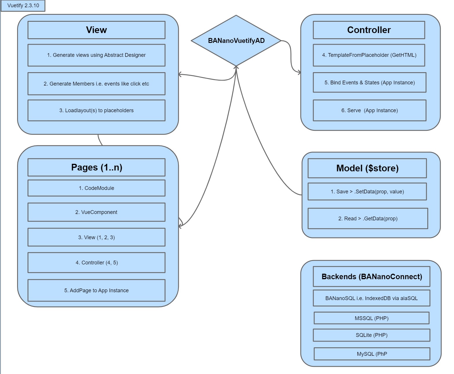 The BANano Custom View Creator is built using the BANanoVueDesigner i.e. VueJS+Vuetify on top of BANano. I opted for that approach because the designer generates most of the source code needed for CRUD. For the backend MySQL is being used. So the less code that was written to make this work was the advantage.