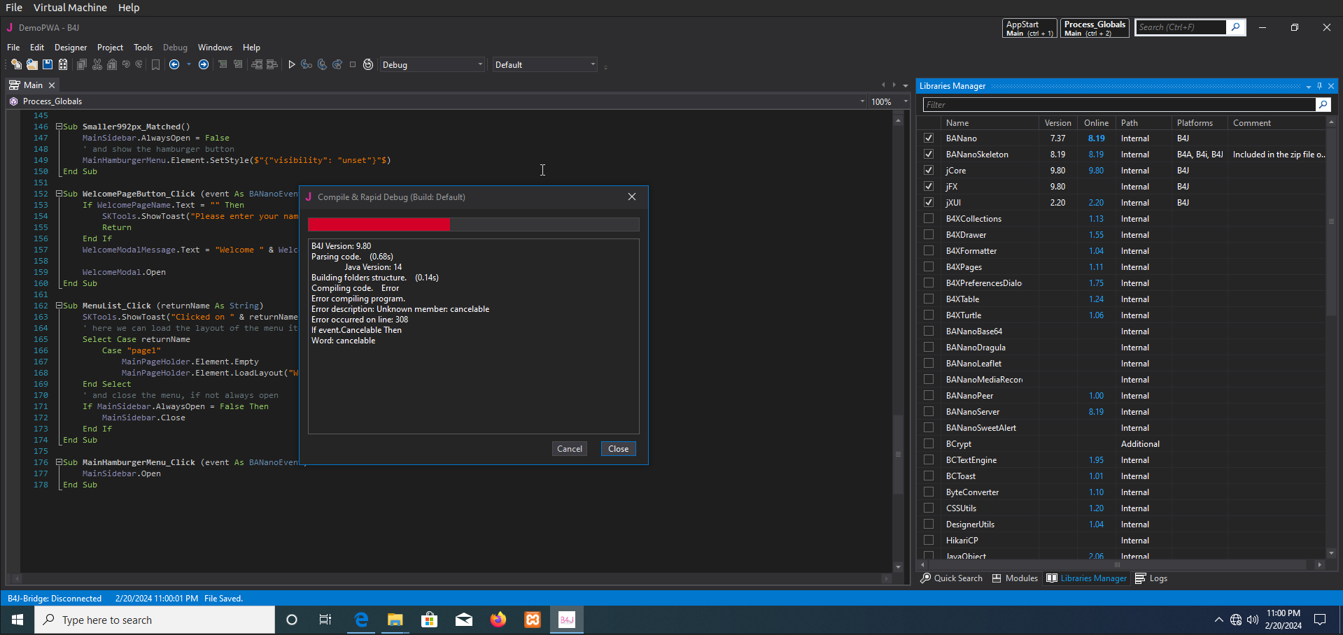 Good Afternoon Everyone, I downloaded the BANano Library and created a new PWA project following the pdf documentation which I also downloaded. However when I want to run the project, it returns an unknown cancelable member error. I have not written anything yet. I attached a screenshot of the error.