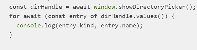 const directoryHandle = window.showDirectoryPicker();