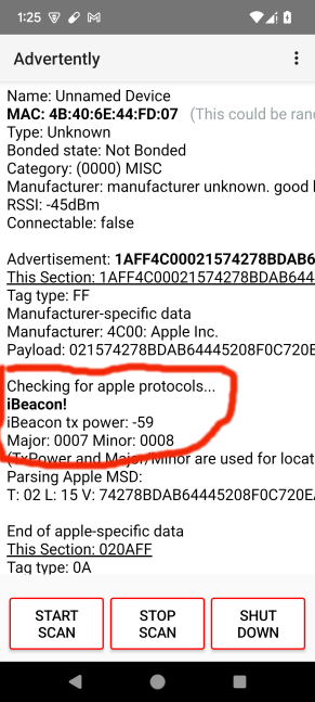 find attached 4 images demonstrating the project. first, we advertise as an ibeacon with major and minor values filled in. in this case, i've put 7 and 8. (if you don't know what the major and minor values do, you probably don't want to be an ibeacon.) the second image shows how the major/minor values appear in a ble scan. in the third image we advertise as a generic ble peripheral. a secret message has been keyed in. in the fourth image, we see how the secret message appears in a scan and how it is decoded (apologies for the poor quality of that image. the hex representation is wide and runs off the screen.)