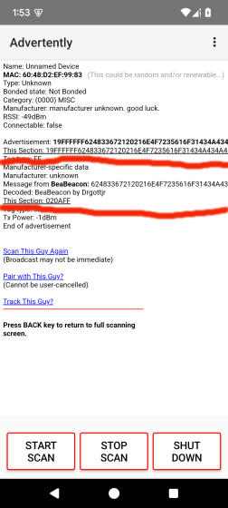broadcasting as a generic peripheral is a even more interesting. i was able to embed a "secret" message in its advertisement and then, using my Advertenty© scanner, decode that message. technically, any ble scanner can see any advertisement (unless hidden), but reading manufacturer specific data is another story. just as you would need access to apple's proprietary data, so access to my "proprietary" message format is required. the message, of course, could be anything within the limits of a legacy advertisement (eg, lat/lon coordinates, meeting place address, phone, etc). BeaBeacon© sets and broadcasts the message, Advertently© deciphers it. your handler could be sitting in a coffee shop sipping on a latte and broadcasting your instructions. you could stop on your e-bike outside, pick up your instructions broadcast to your phone and go on your merry way.