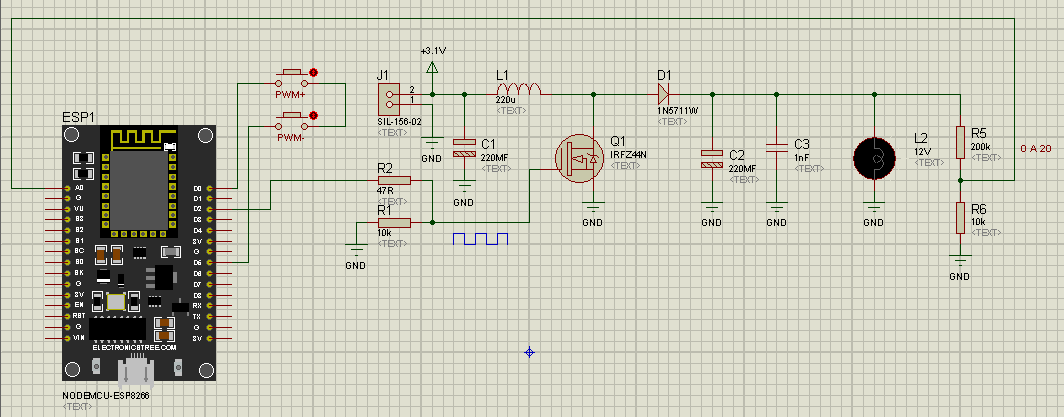 Create a Boost (step-up) converter controlled by an ESP8266 (Wemos D1 Mini), capable of increasing a low input voltage (e.g., 3.1V) to a regulated output voltage (e.g., 14.5V), using PWM (pulse-width modulation).