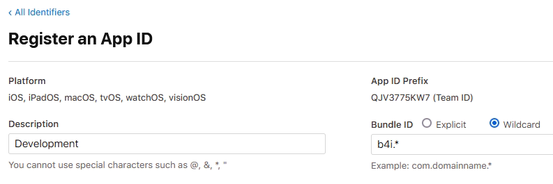 - Followed the video guide for B4i - Certificate and provision profile, where I used the new Sign Key