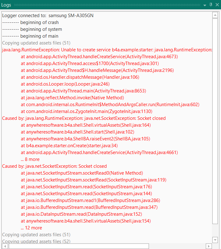 java.lang.RuntimeException: Unable to create service b4a.example.starter: java.lang.RuntimeException: java.io.IOException: Stream closed.