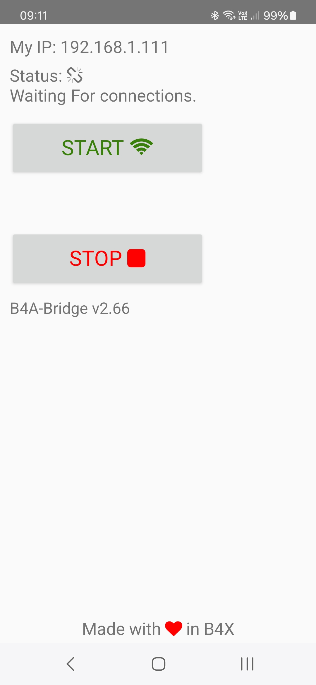 Apro l'app B4A sul mio telefono e resto in attesa di connessione al mio IP 111;