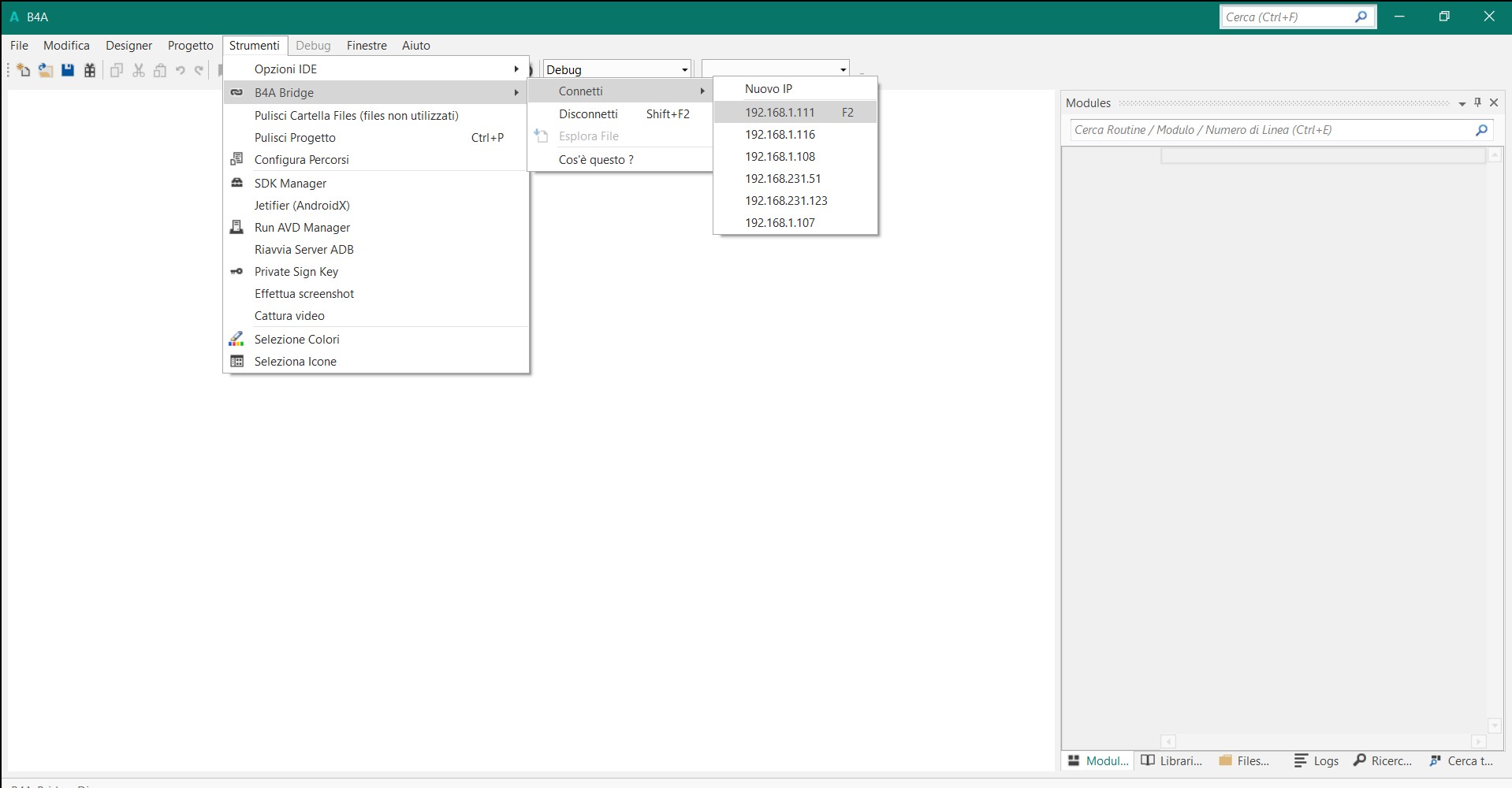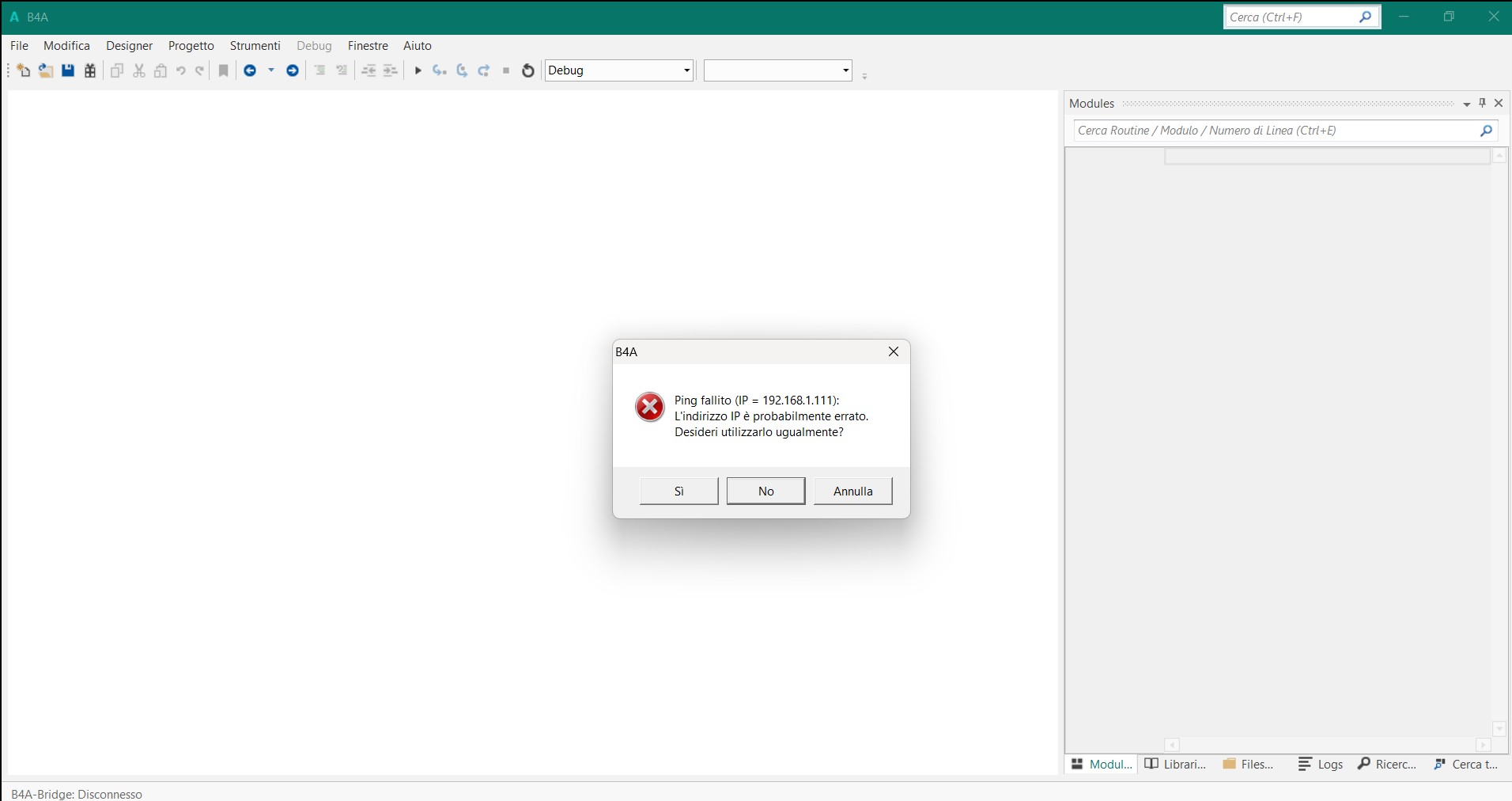 Apro quindi sul PC B4A e provo a connettermi all'IP 111.