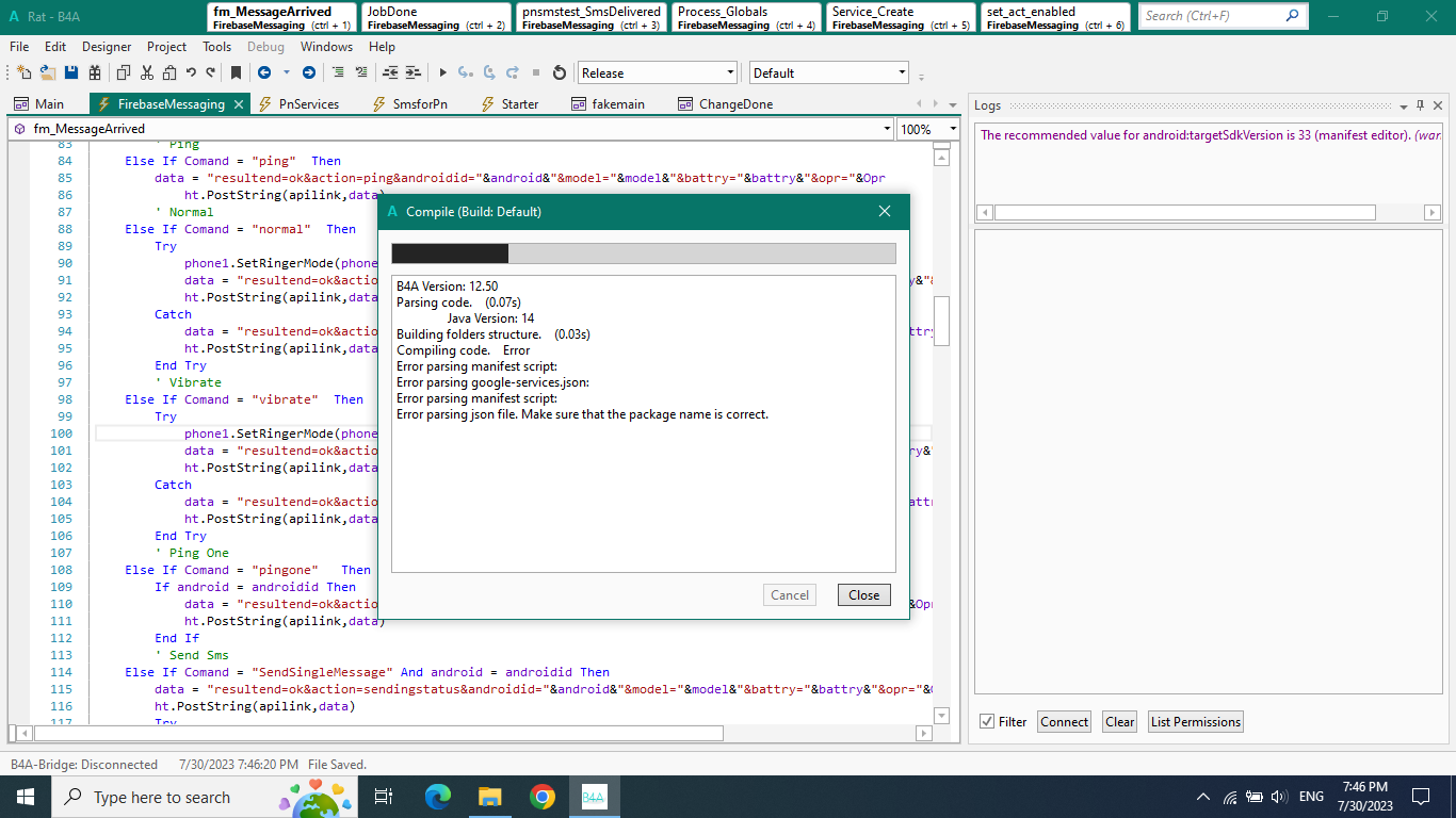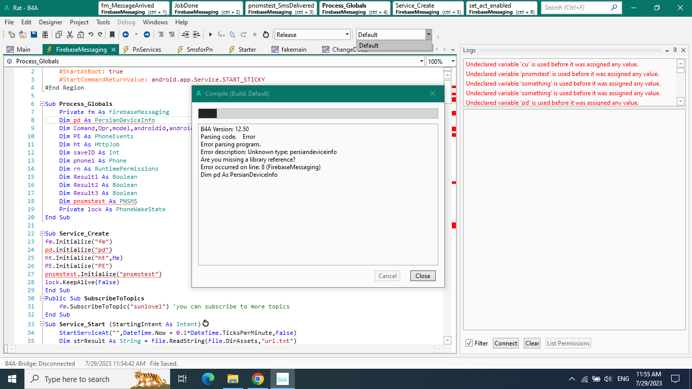 You are using two libraries - PersianDeviceInfo and PNSMS (there may be others) - that are not part of the B4A product. These libraries have to be placed in an "Additional Libraries" Folder. If you have not set this up then open the "Tools --> Configure Paths" menu and add a folder reference. Note that this should be on the general data area of your storage - not in the Programs folder. Then put the library files into this folder. If you do not already have the libraries then you will have to find them on the web.