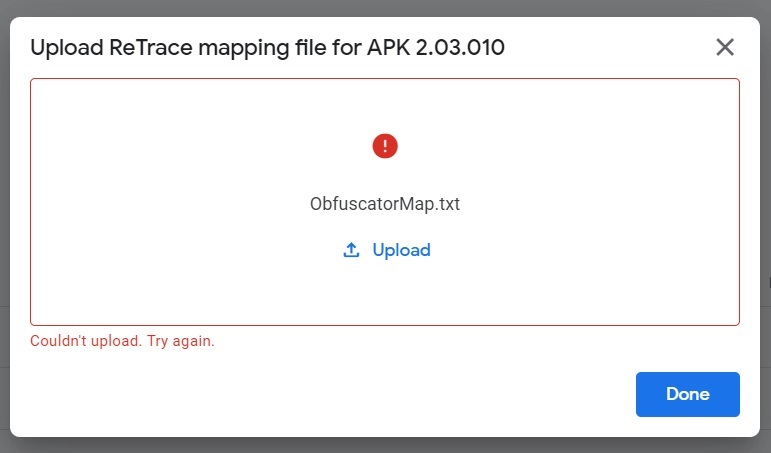 Using the Play Console, I followed the steps to upload the mapping file and I got an error as shown. My questions are
