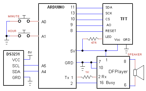 DS3231 RTC with TFT display and DF-Player to make the cuckoo sound. Every 15 minutes it sounds once and on the hour it sounds the hour.