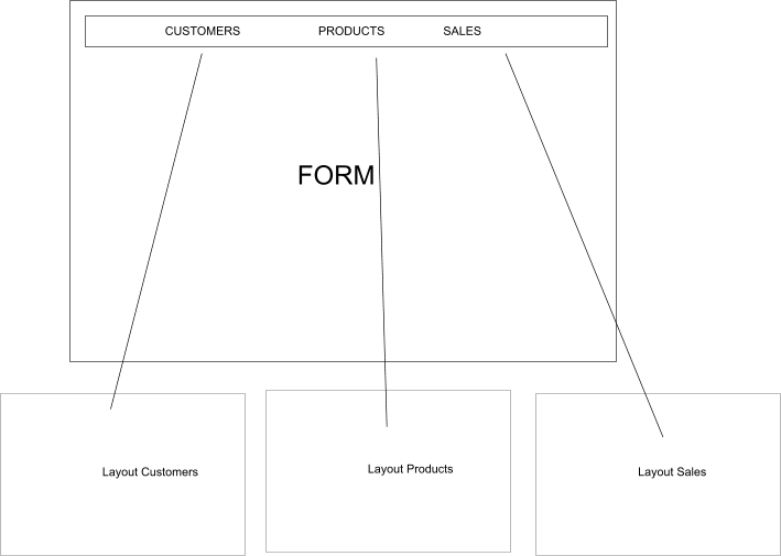 I want to develop a sqlite app with 1 Form and 3 layouts(Customers, Products, Sales) and 1 menu bar. My problem is that on each layout i must add 1 Menubar and it is very hard to update each menubar on every layout when its needed. Is a way to add the menuBar on Form and load the layouts below the menu bar? Thank you!
