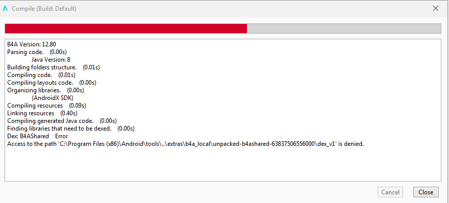 Access to the path 'C:\Program Files (x86)\Android\tools\..\extras\b4a_local\unpacked-b4ashared-63837506556000\dex_v1' is denied.