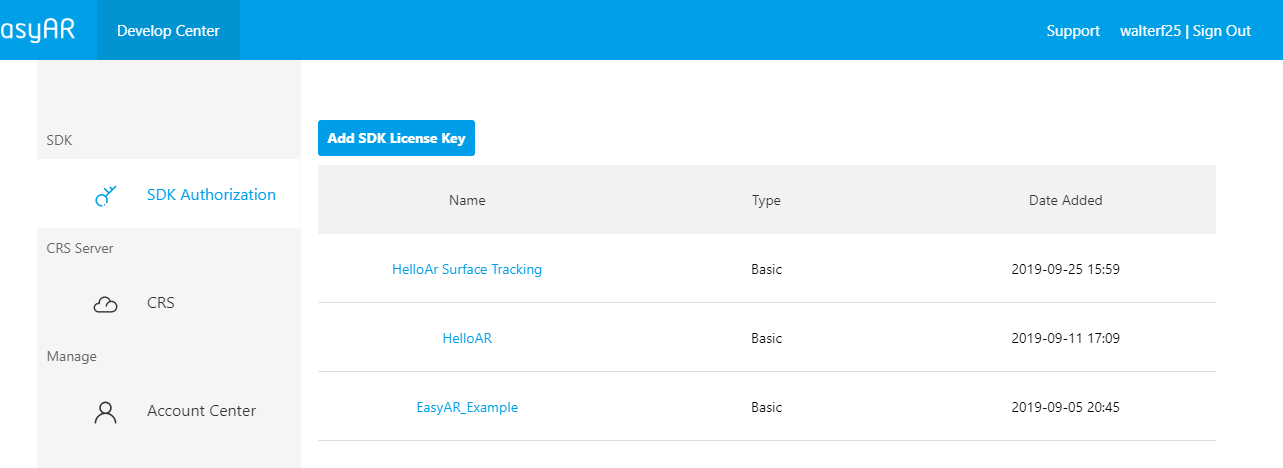 Ok, in order to be able to use this library you will need to register for an account at EasyAR website once you have signed up, you can login and you will need to create an SDK License key.