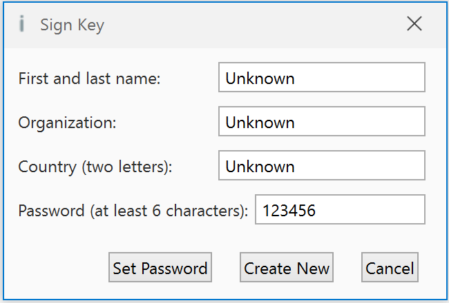Then I tried to create the "Sign key" but when I push "Create New" I got this error: