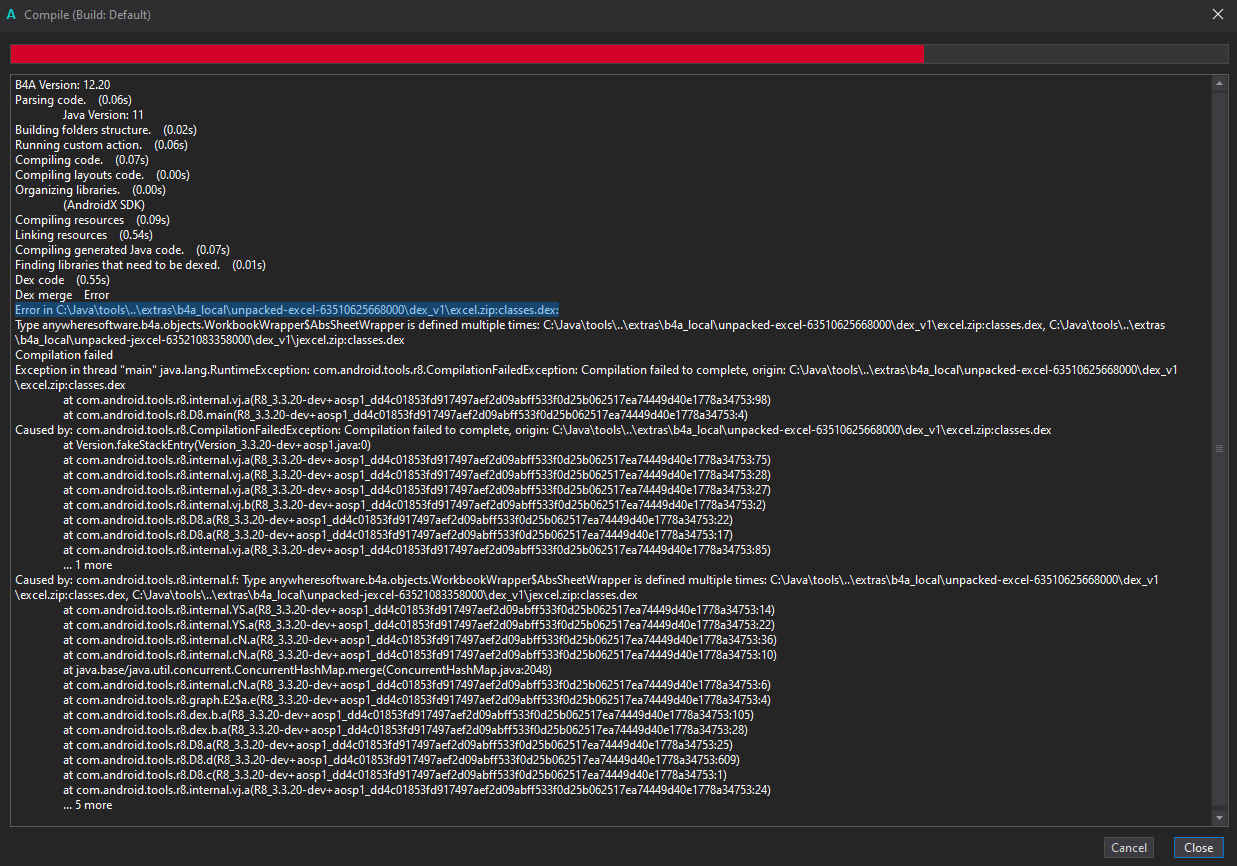 Exception in thread "main" java.lang.RuntimeException: com.android.tools.r8.CompilationFailedException: Compilation failed to complete, origin: C:\Java\tools\..\extras\b4a_local\unpacked-excel-63510625668000\dex_v1\excel.zip:classes.dex