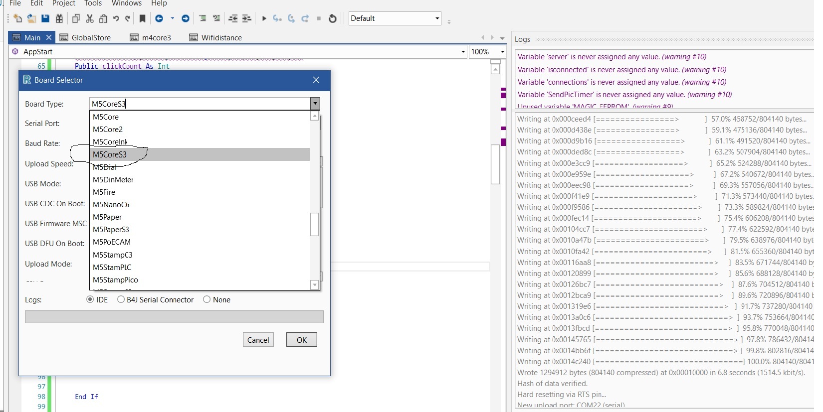 I am using the M5Core3. It has an ESP32S3 controller. I added the M5Core3 board to the Arduino board list. The original ESP32 board was already on the Arduino board list before. When I search for M5core3 boards in the Arduino application, both M5Core3 and ESP32 are listed in the Arduino board list (Image 1). I can choose which to select. In the b4R application, it shows only one (Image 2). I found out that it only displays the ESP32 version, and even when selected, it does not provide the correct results. To solve the problem, I had to uninstall the ESP32 board and keep only the M5Core3 board to make it work; however, this resulted in my being unable to find the other ESP32 boards in the list. Does anyone have suggestions on how to solve the problem and make the B4R application display both a board, similar to an Arduino Application?
