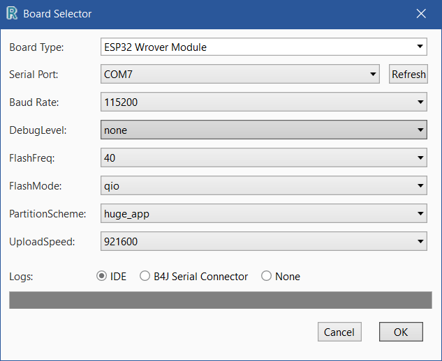 In B4R the flashing of the min template app is OK, but no log output.