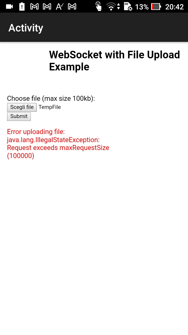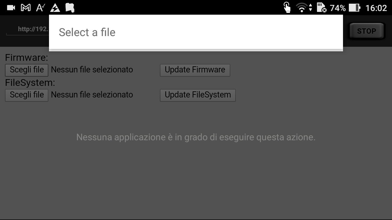 With current code I wrote I'm able to see on the WebView the ESP OTA update page, but when I press the button to choose a binary file (.bin)