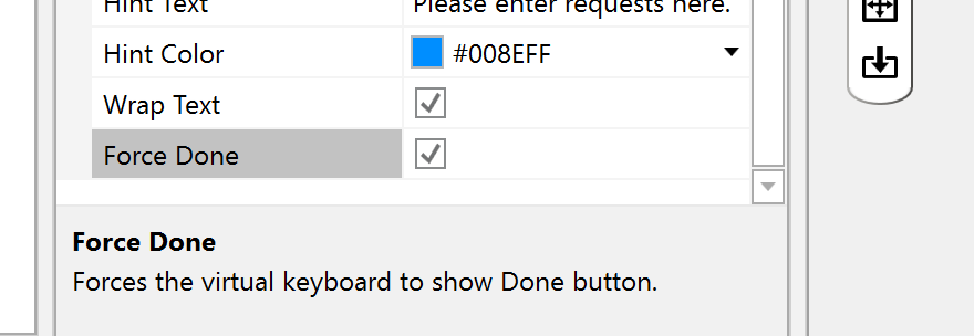 In my EditText field from the Designer, I have the "Force Done" property set. The "Done" button is not displayed on the virtual keyboard. Instead, the "Newline" button is displayed. Is there a way using coding to force the "Done" button to be displayed?
