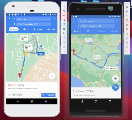 Sullo smartphone a sinistra (stessa identica app e stesso identico indirizzo di destinazione) dice che per andare da Saronno (VA) dove sono io attualmente a Porto Viro (RO) ci vogliono 4 minuti.